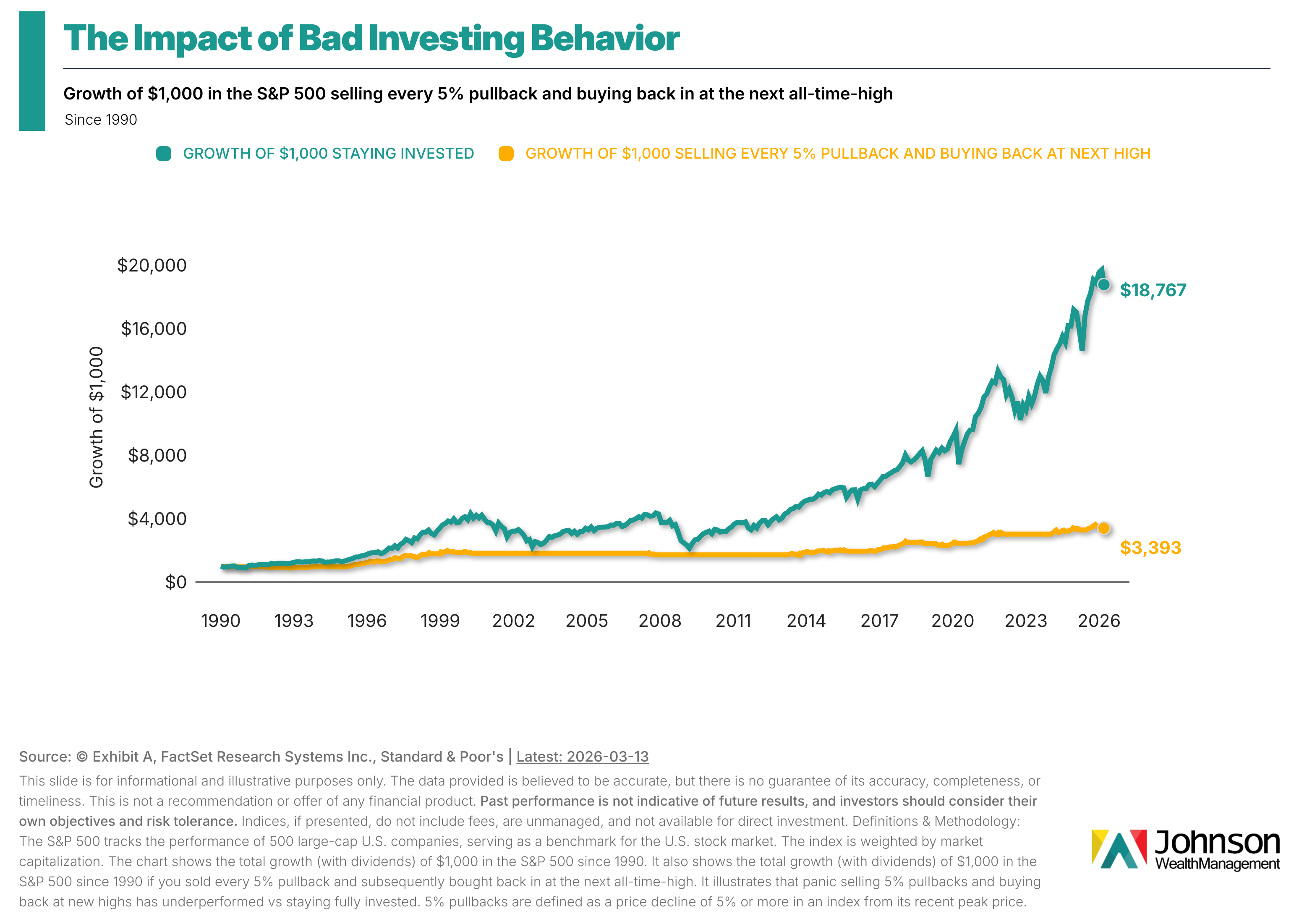 Let’s say you were the kind of investor that sold after every 5% pullback—fearing a further decline—and then bought back in at the next all time high when “things calmed down”.