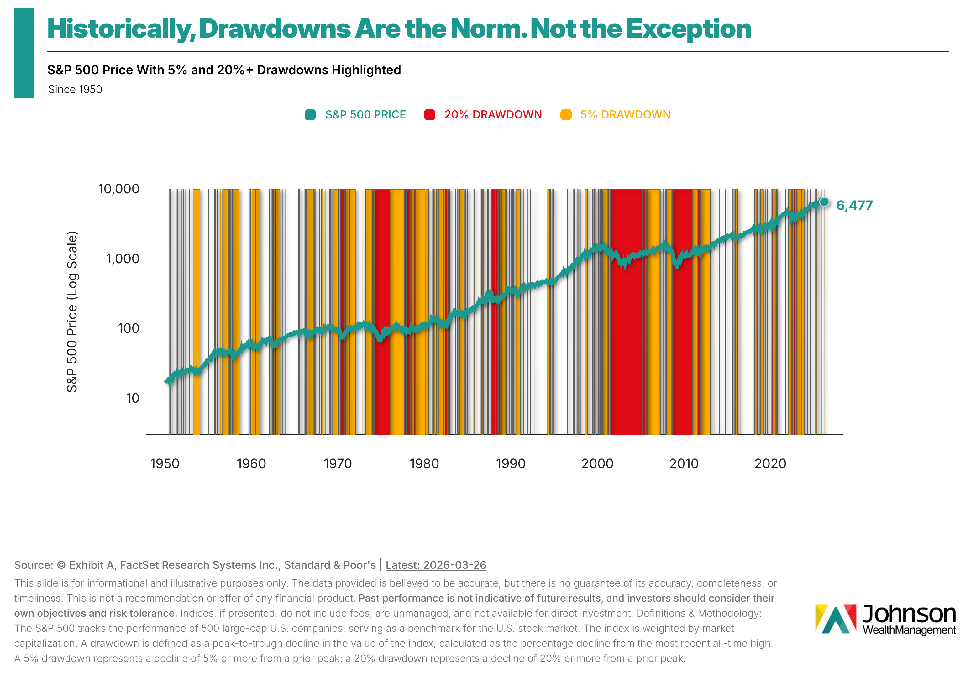 Let’s go out further to 1950, with the help of Exhibit A, and make the visualization more compelling by showing the S&P 500 price in the green line on its upward trajectory and all the 5% drawdowns in yellow and 20% bear market declines in red along the way.